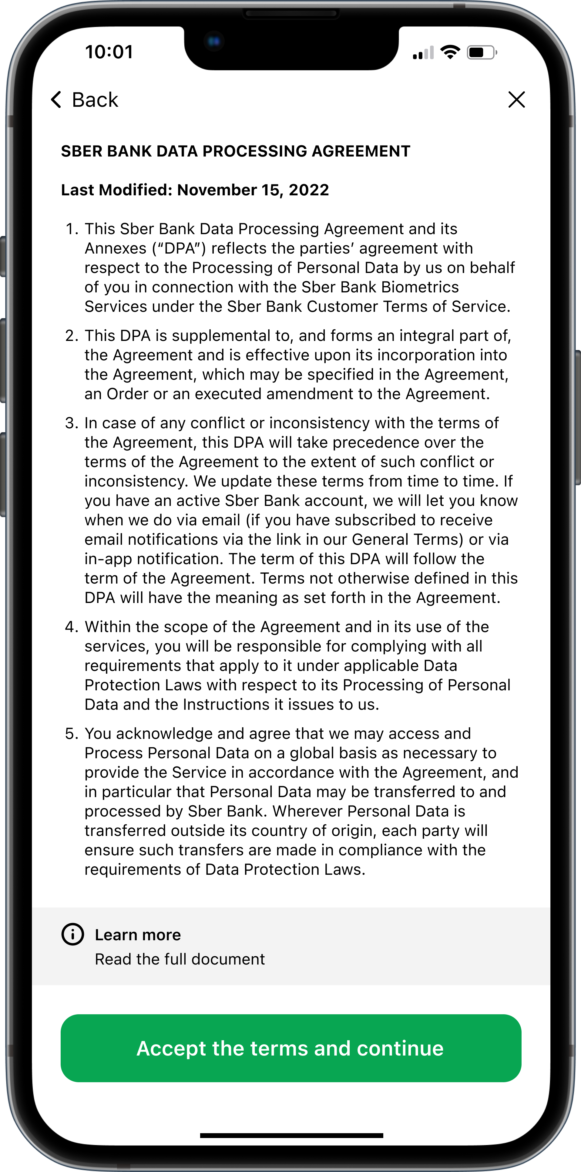 Instead of having users tick a box and agree to the data processing terms, I created another page with DPA highlights to explain how Sber Bank handles users’ biometric data and allow them to navigate directly to the full agreement to learn more.