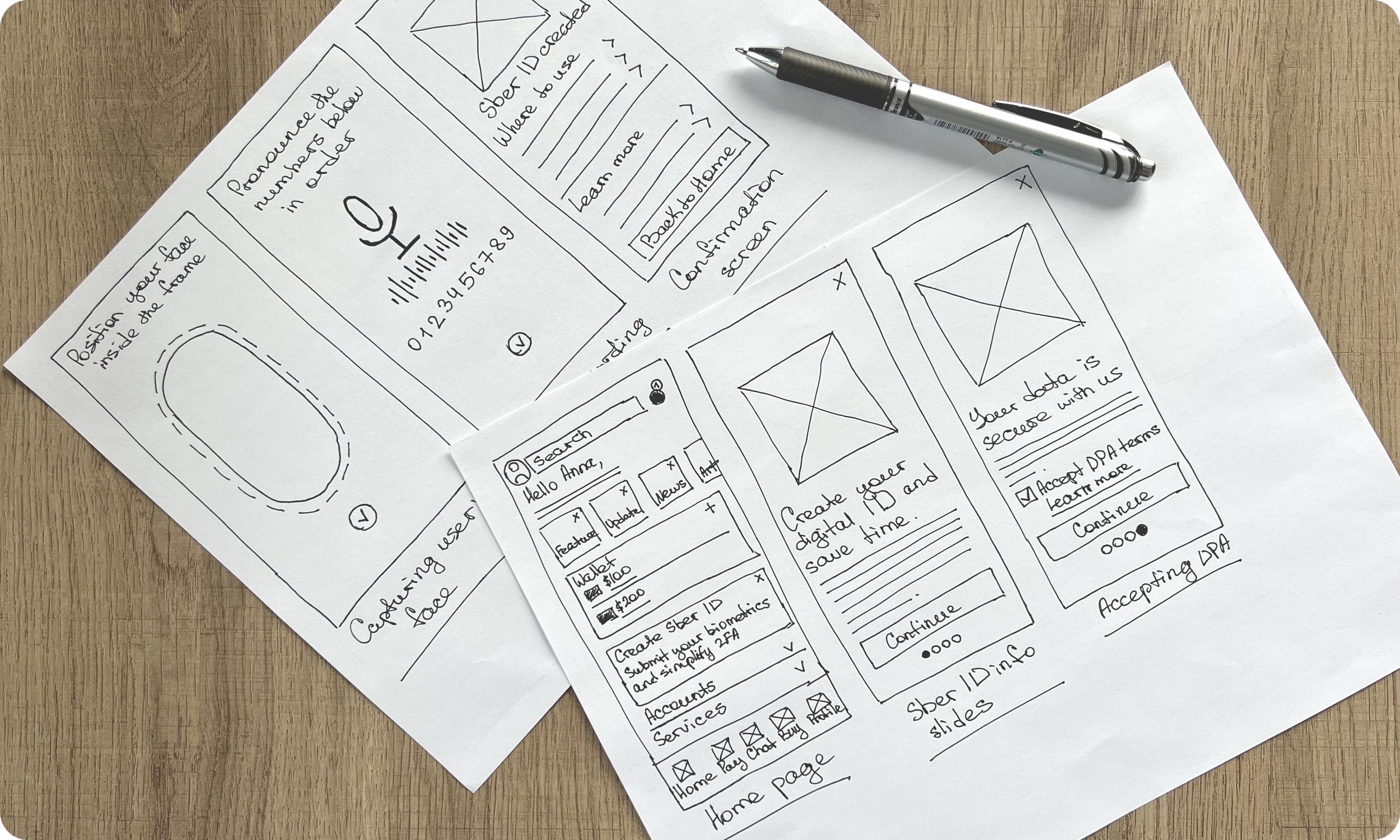 When I started sketching my main goal was to keep the process of submitting biometric data simple and transparent. I wanted users to learn about Sber ID advantages in the form of a short onboarding process and feel supported and well-informed when they were asked to capture their face and record their voice.