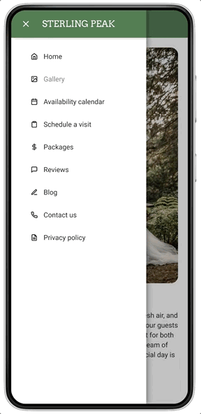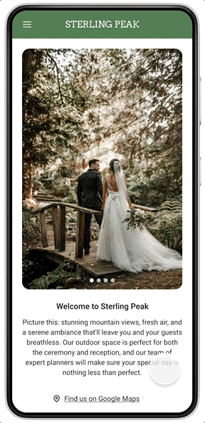 I created photo albums of the weddings that had previously taken place at “Sterling Peak” instead of simply providing venue pictures to make it more heartfelt and personal. Real wedding pictures compliment clients’ reviews very well, providing a sense of security to new app users.